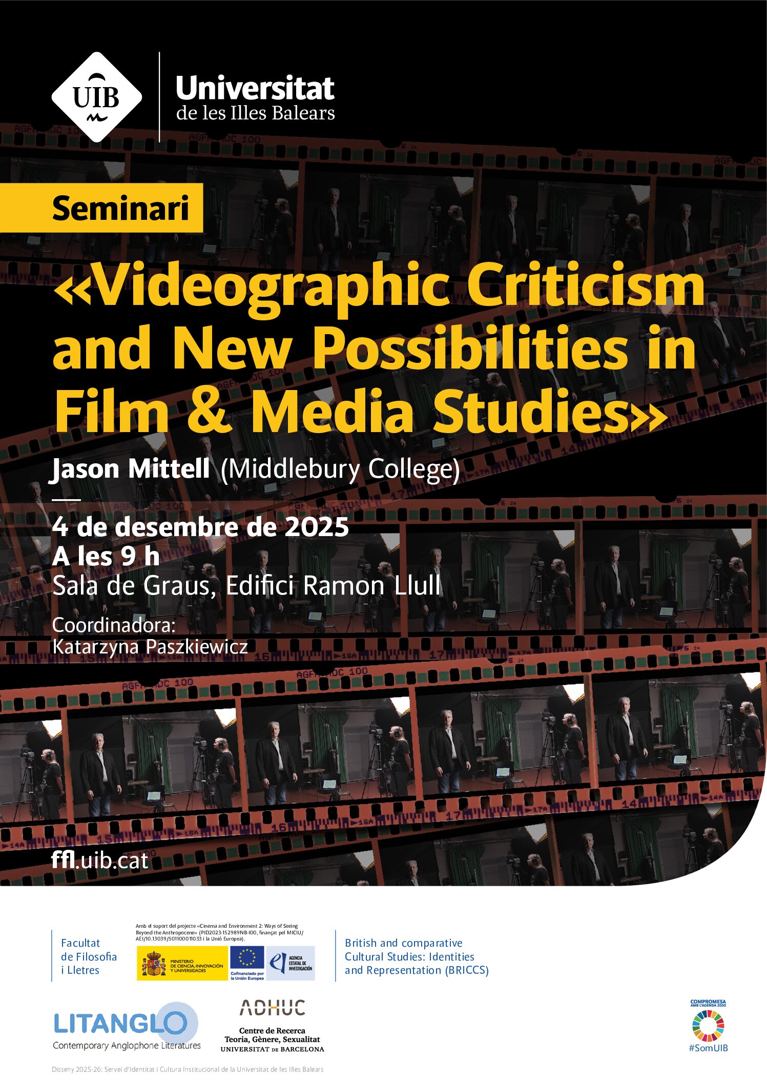 The Faculty of Philosophy and Arts of the University of the Balearic Islands (UIB) is pleased to host a seminar by Professor Jason Mittell (Professor of Film and American Studies, Middlebury College, USA), a leading figure in film and media studies and director of the acclaimed Workshop on Videographic Criticism at Middlebury College. The seminar will explore how digital technologies are reshaping the ways scholars can analyze and present their research through the medium of the video essay. Designed for students and faculty interested in critical and creative approaches to audiovisual storytelling, the session will highlight how film and digital media can serve as powerful tools for academic inquiry and innovation.
